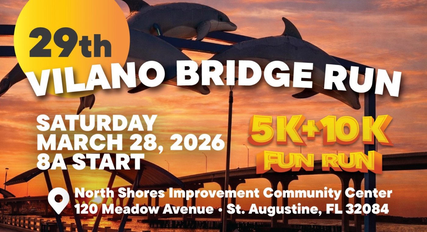 Celebrating 29 years, the Vilano Bridge Run invites runners and families to enjoy scenic, officially timed 5K and 10K courses beginning at the Vilano Beach Community Center and Park. Both the 5K and 10K routes wind through the picturesque Vilano Beach community, crossing the iconic Vilano Bridge with sweeping views of the Intracoastal Waterway and surrounding beaches. The 10K course continues through the beautiful grounds of the Florida School for the Deaf & Blind campus.