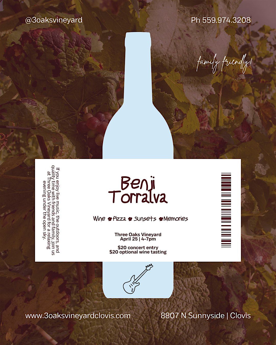 Join us at Three Oaks Vineyard for an intimate evening under the oaks—where good music meets great company.