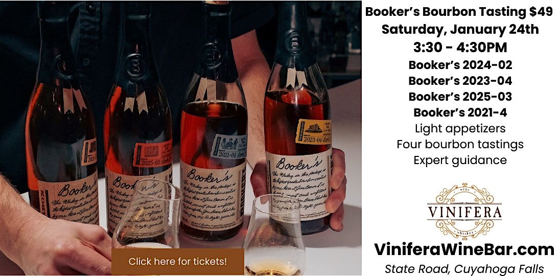 Join us at Vinifera on January 24th at 3:30PM and experience four exclusive Booker's bourbons, as well as expert instruction, heavy discussion, and light appetizers.