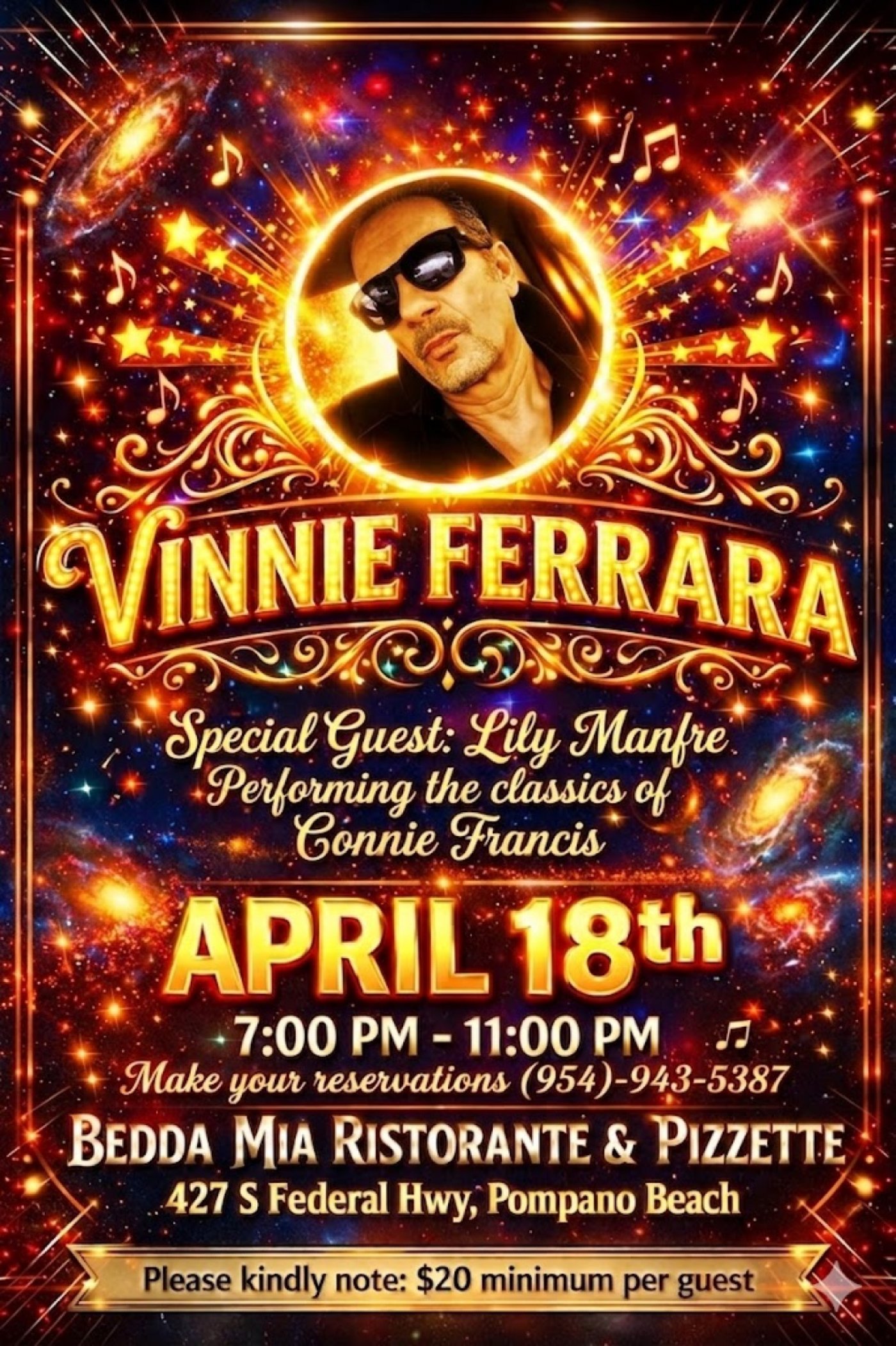 Join us at Bedda Mia Ristorante for a night of nostalgia and world-class entertainment. We are thrilled to welcome back the incomparable Vinnie Ferrara, featuring very special guest Lily Manfre.