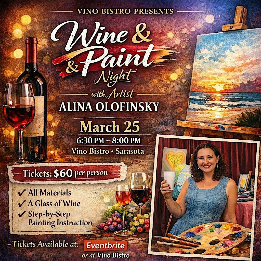 Join us for a fun, in-person night at Vino Bistro where creativity meets relaxation! Sip on your favorite wines while learning to paint with the talented Alina Olofinsky. No art experience needed—just bring your enthusiasm! All materials, one glass of wine, and step by step instruction included. It's the perfect way to unwind, socialize, and create a masterpiece you'll be proud of. Grab your friends and let's make it a night to remember!