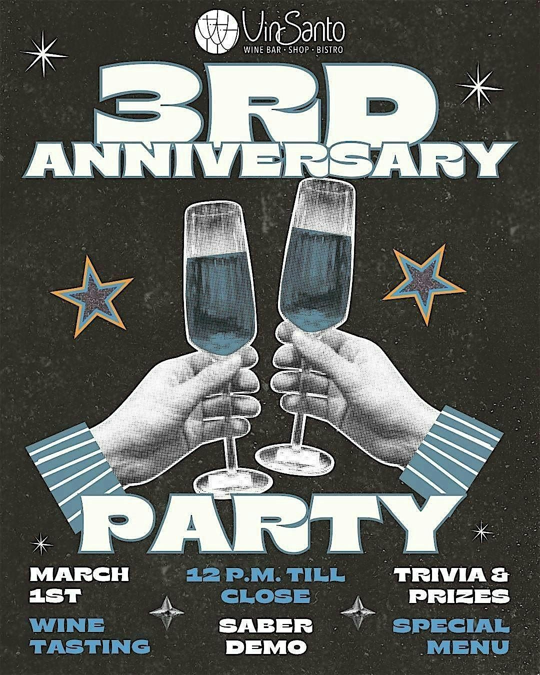 Come celebrate VinSanto's 3rd Year Anniversary with us at VinSanto on Memorial Drive in Houston, TX, USA. Join us for an unforgettable day filled with delicious food, great music, and amazing company.