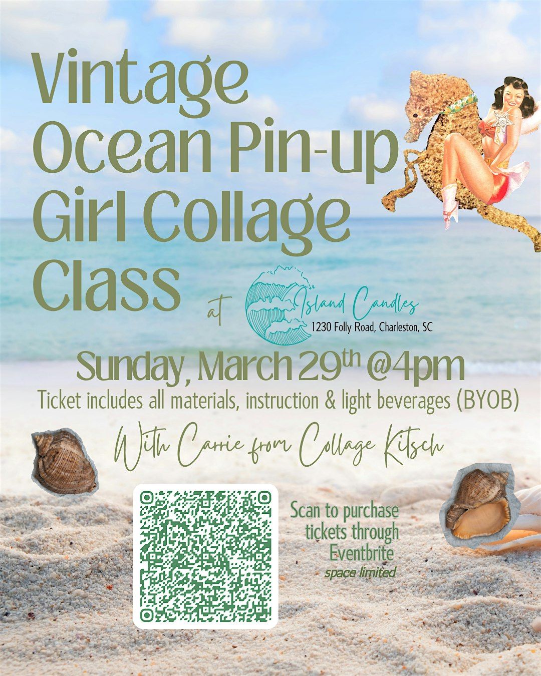 Join Island Candles' & Collage Kitsch where you'll learn how to assemble a gorgeous, beachy analog collage, featuring vintage pin up girls, using images cut from vintage books and magazines. During the 1 1/2 hour class, you'll learn which tools to use, how images can be stacked, and what it takes to really make a collage pop! Participants will leave with a unique piece of art that is sure to be a conversation piece. Please bring a sharp pair of scissors and an X-Acto knife, all other materials will be provided!