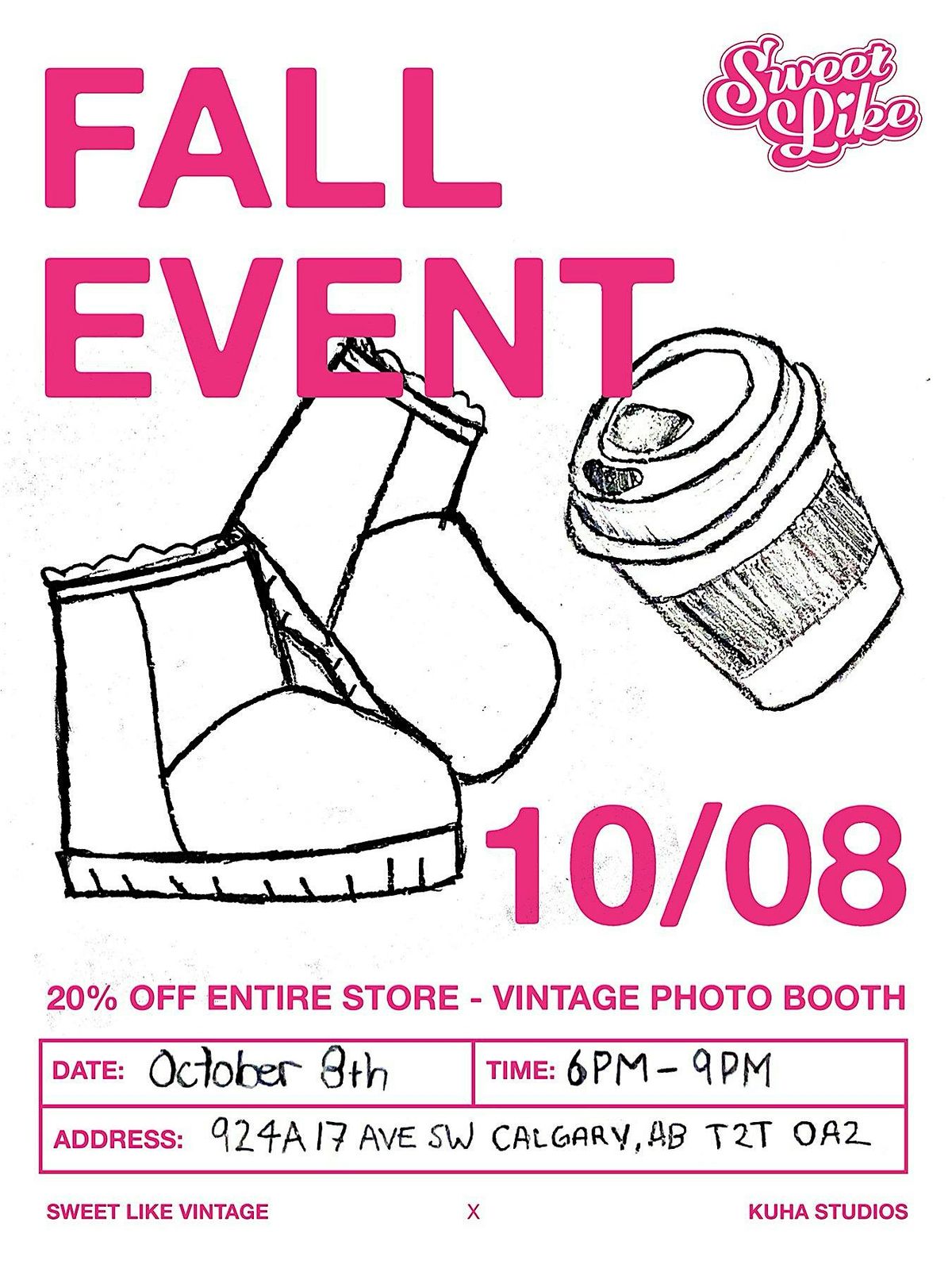 Come join us at our Fall Event for an evening of vintage shopping (20% OFF STOREWIDE) and fun photo booth moments! Located at Sweet Like Vintage (924a 17 Ave SW), this in-person event is perfect for those looking to add some unique pieces to their wardrobe or capture memories with friends. Browse through a curated selection of vintage clothing, accessories, and home decor while striking a pose at our photo booth provided by @Kuhastudios.yyc. Don't miss out on this exciting opportunity to score some one-of-a-kind finds and create lasting memories. See you there!