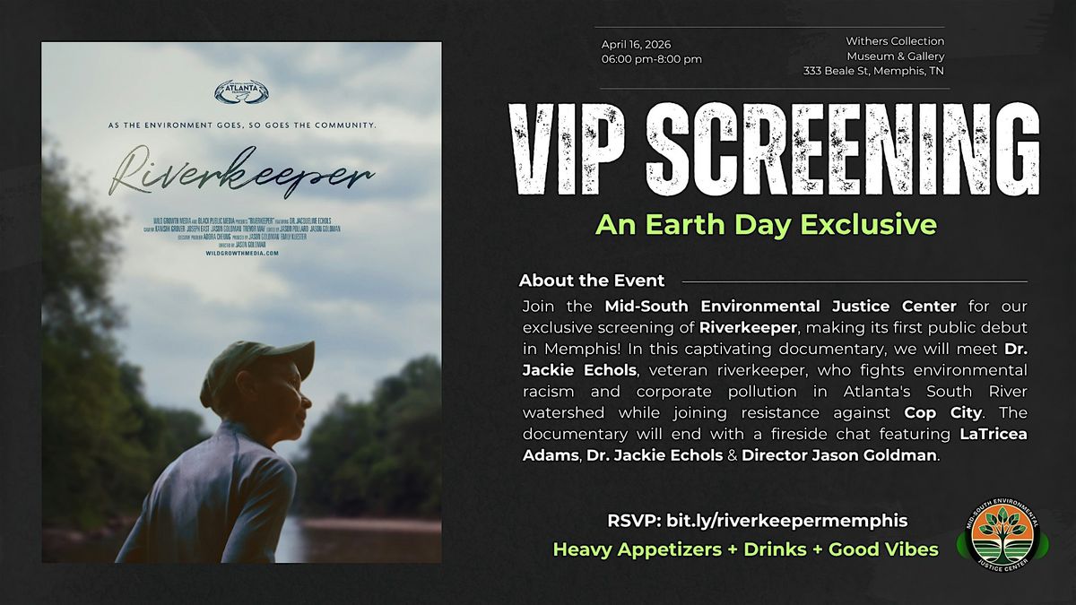 Join the Mid-South Environmental Justice Center for our exclusive screening of Riverkeeper, making its first public debut in Memphis! In this captivating documentary, we will meet Dr. Jackie Echols, veteran riverkeeper, who fights environmental racism and corporate pollution in Atlanta's South River watershed while joining resistance against Cop City. The documentary will end with a fireside chat featuring LaTricea Adams, Dr. Jackie Echols & Director Jason Goldman.