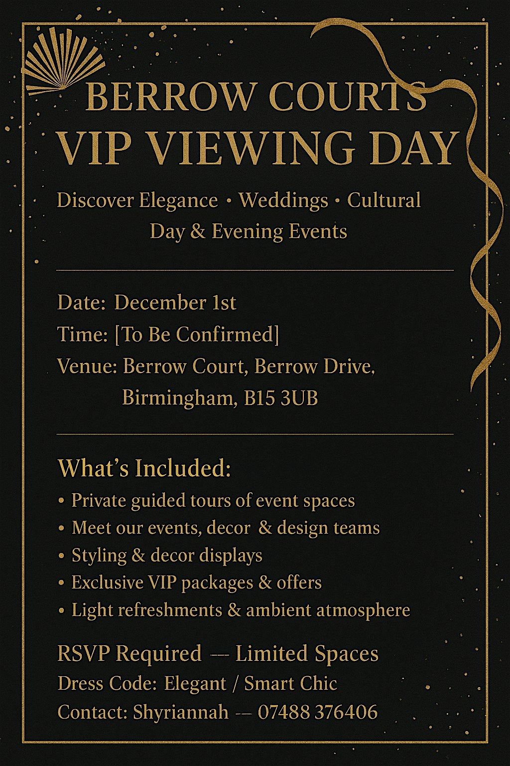 Come join us for a day at Berrow Court! tour our stunning venue . Enjoy complimentary refreshments and mingle with other guests. This is your chance to meet the staff , see the venue in all its glory and envision your dream event here. Don't miss out on this exclusive opportunity to experience Berrow Court .The day will entail :