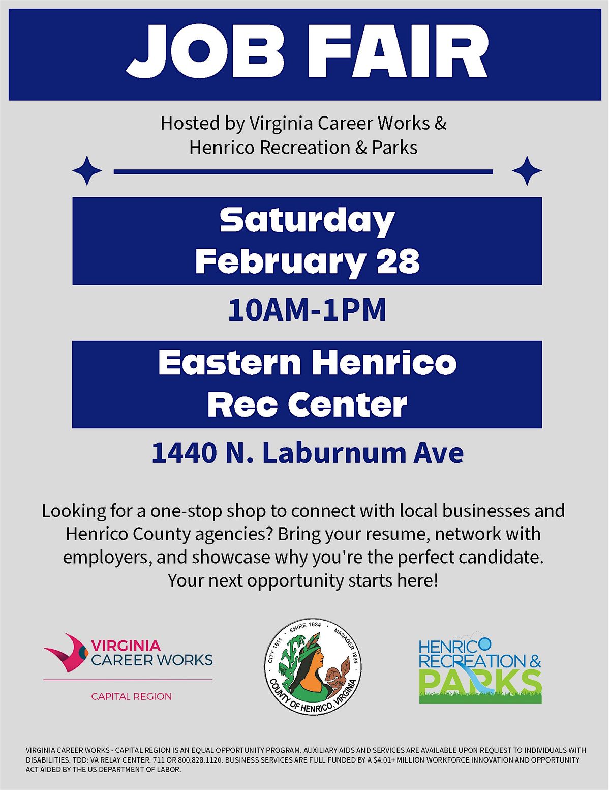 Looking for your next big opportunity? Join us along with Henrico Rec & Parks Dept. at the Virginia Career Works - Capital Region's February 2026 Career Expo! Network with local employers, explore exciting careers, and discover resources to boost your job search. Whether you're starting out or making a change, this event is the perfect place to connect and grow your future. Don’t miss out!