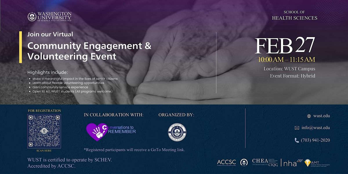 Looking for a meaningful way to give back to the community? Join us for a Virtual Community Engagement & Volunteering Event, organized by the Washington University of Science and Technology (WUST) – School of Health Sciences, in collaboration with Conversations to Remember.