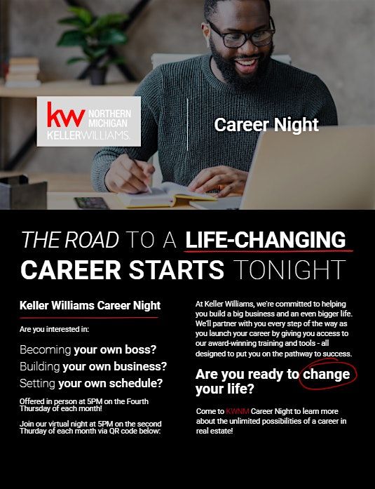 Join us for an exciting evening at Keller Williams - Northern Michigan! If you're interested in a career in real estate, this event is perfect for you. Find out why Keller Williams is the #1 Brokerage in the country- our Scholarships, Training, Coaching, and MORE! Discover what a future in Real Estate looks like for YOU!
