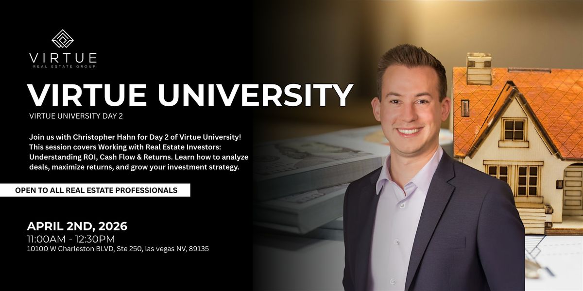 Join us with Christopher Hahn for Day 2 of Virtue University! This session covers Working with Real Estate Investors: Understanding ROI, Cash Flow & Returns. Learn how to analyze deals, maximize returns, and grow your investment strategy.