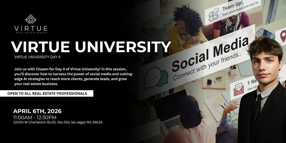 Join us with Chasen for Day 4 of Virtue University! In this session, you’ll discover how to harness the power of social media and cutting-edge AI strategies to reach more clients, generate leads, and grow your real estate business.