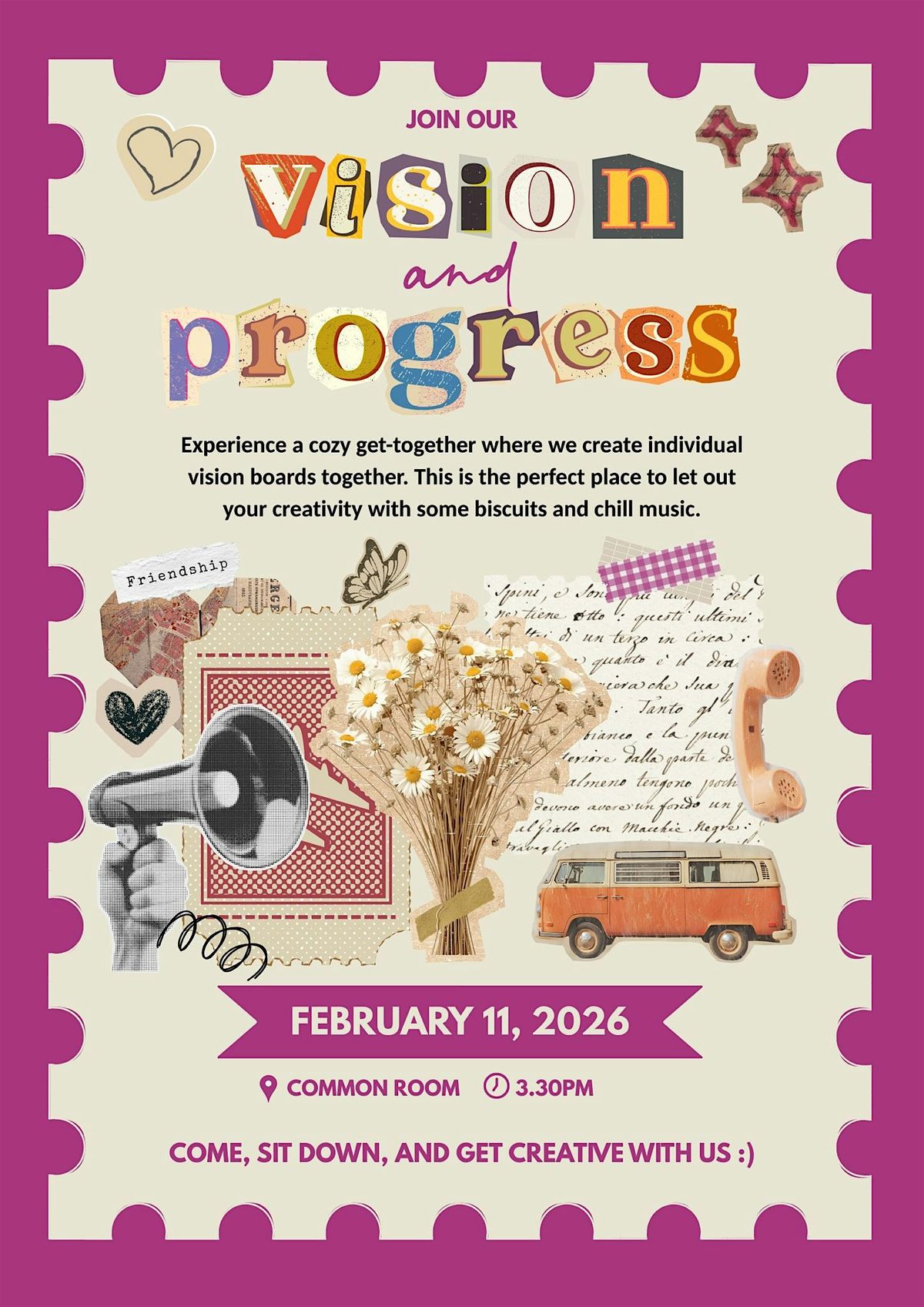 Join us in the common room for a chill journaling, scrapbooking, and vision board event! Whether you want to map out your goals, reflect on the semester, or create something cute, this space is for you.