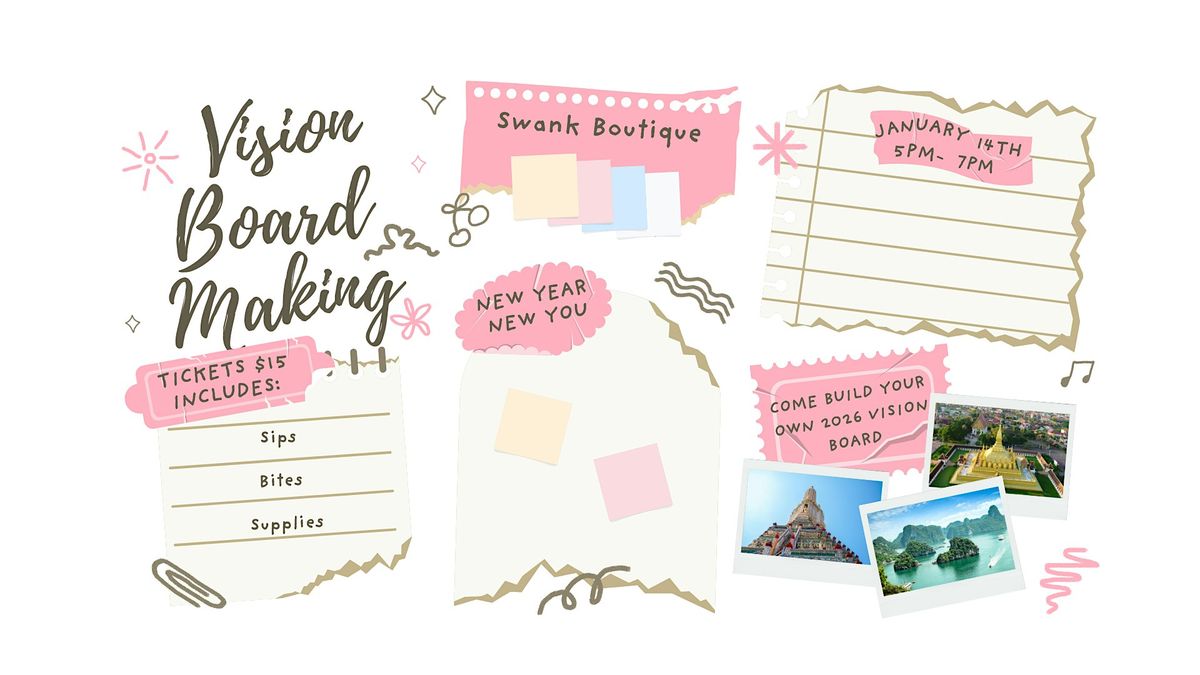 Welcome to Vision Board Making at Swank Boutique! Join us on January 14, 2026 at 5:00 PM for a fun and creative evening. Let's gather to visualize our goals and dreams for the year ahead. Bring your favorite magazines, scissors, and a positive attitude. We'll provide the boards and glue! Get ready to cut, paste, and manifest your desires. See you there!