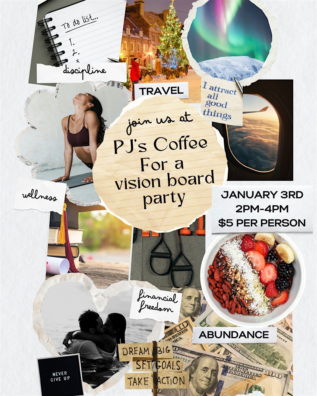 Ready to kickstart your dreams? Join us in person at PJ's Coffee for a fun and creative Vision Board Party! Bring your goals, grab a cup of your fave brew, and let’s craft some inspo together. It’s all about good vibes, big dreams, and making your vision come alive. Don’t miss out on this chill, motivating hangout!