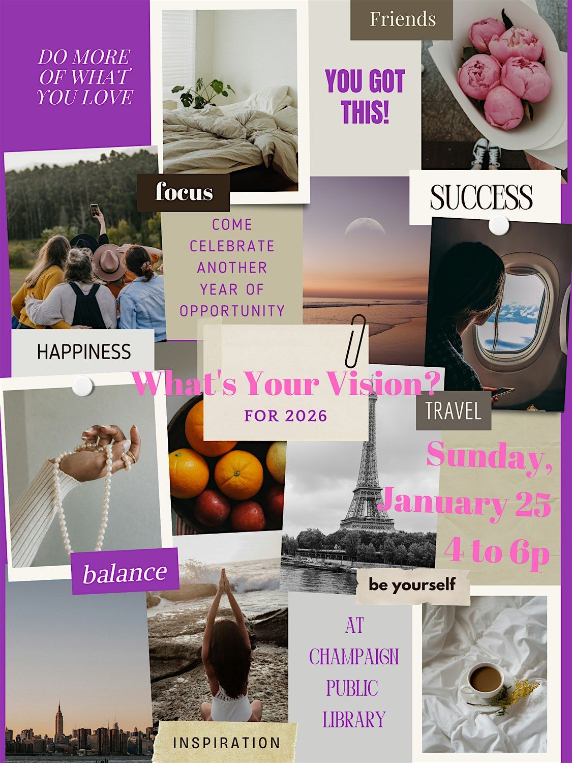 Welcome to the Vision Board Party at Champaign Public Library! Join us on January 25, 2026 at 4:00 PM (Central Time) for a fun and creative evening.