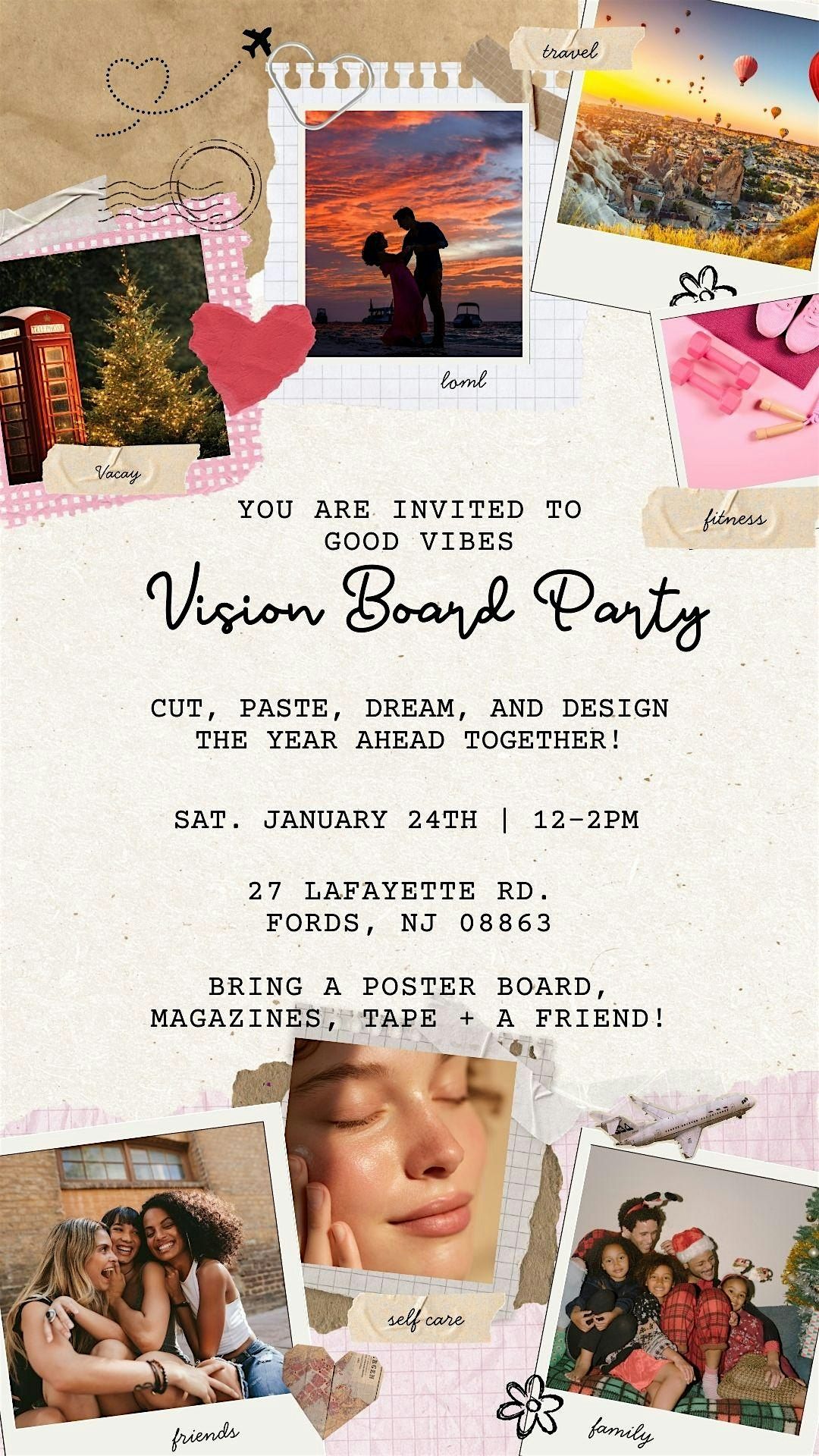 Get ready to dream big and have a blast at our Vision Board Party! This is an in-person event where you can unleash your creativity, connect with awesome people, and map out your goals for the future. Bring your favorite magazines, scissors, and glue—or just come as you are and dive into some inspiring vibes. It’s all about turning hopes into visuals and having fun doing it. Don’t miss out on this uplifting experience!