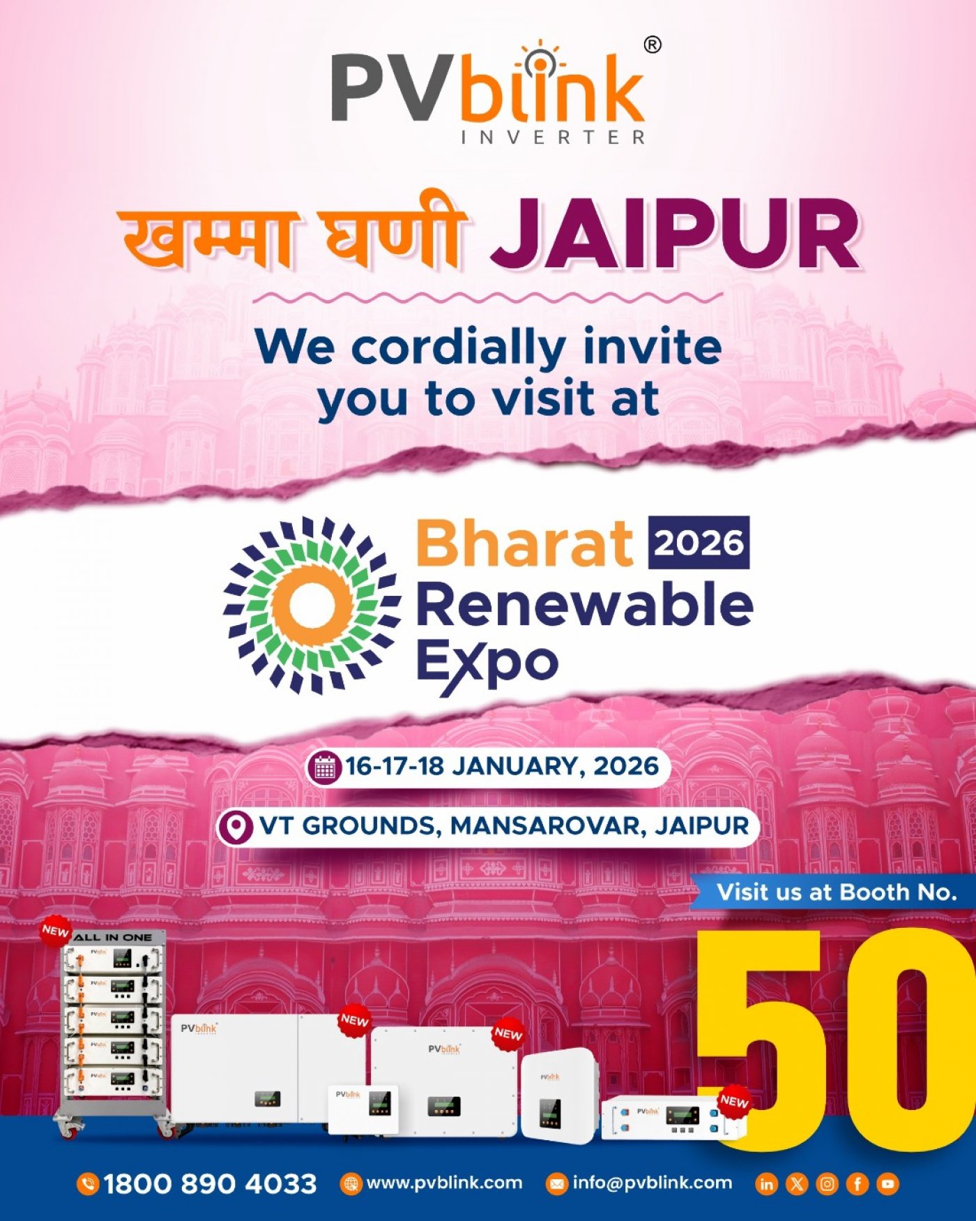 Visit PVblink Inverter at Bharat Renewable Expo 2026 and discover next-gen All-in-One and hybrid inverter technologies.
