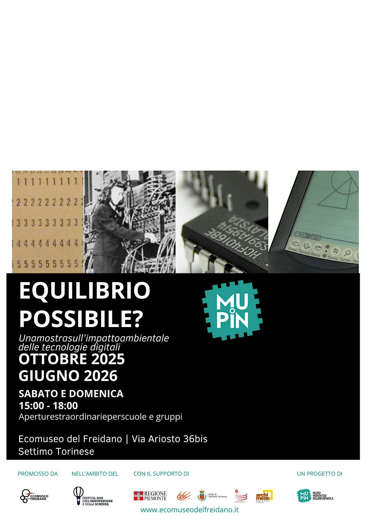 Presso il secondo piano dell’Ecomuseo del Freidano di Settimo Torinese, è visitabile la mostra “Equilibrio possibile?” curata dall’Associazione Museo Piemontese dell’Informatica.