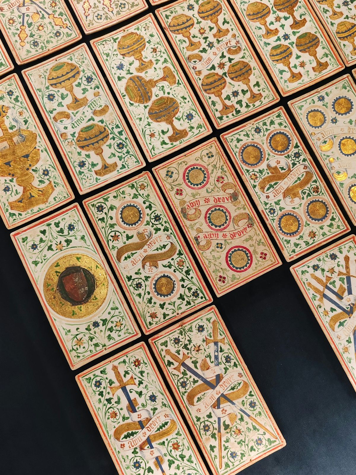 I primi mazzi erano preziosissimi, delle vere opere d’arte, come il Mazzo Colleoni, diviso tra l’Accademia Carrara, la Morgan Library di New York e una collezione privata, ma eccezionalmente riunito per questa mostra!