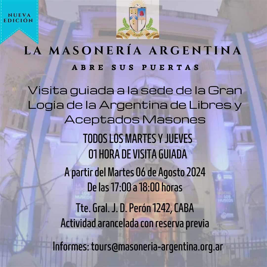 ✨¡ACTIVIDADES SEMANALES!...✨ . ✒️Historias Iniciáticas Presenta un nuevo formato de: . ⚜️"LA MASONERÍA ARGENTINA ABRE SUS PUERTAS"⚜️ . ✒️Visitas guiadas a la sede de la Gran Logia de la Argentina de Libres y Aceptados Masones. . ✒️Fecha: Martes y Jueves (A partir del Martes 18 de Marzo 2025). ✒️Hora: 16:00 horas (puntual) a 17:00 horas. ✒️Lugar: Tte. Gral. J. D. Perón 1242, CABA. . ✒️ Actividad selecta con reserva previa. ✒️ Cupos limitados. . ✒️Informes: [email protected] #historiasiniciáticas #masoneriauniversal #masoneria #masonería #masoneriaargentina #masones #masonesdelmundo #misterios #historia #arte #cultura #granlogiaargentina #granlogia #logia #visitasguiadas #recorridosespeciales #visitaguiada #recorridoespecial #buenosairesargentina #buenosairestravel #buenosairesturistas #buenosairesturismo #buenosaires #BA #argentina #argentinatravel #argentinatourism #argentinaturismo