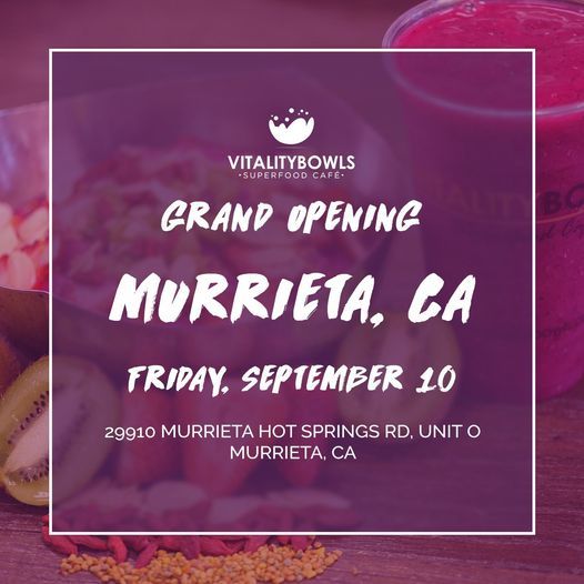 Hey Murrieta, we can't wait to meet you! Come celebrate our opening with us on Friday, September 10! ? Plus, get a FREE medium or large açaí bowl or smoothie with the purchase of medium or large bowl or smoothie, Friday, September 10 through September 12! ? See you soon!