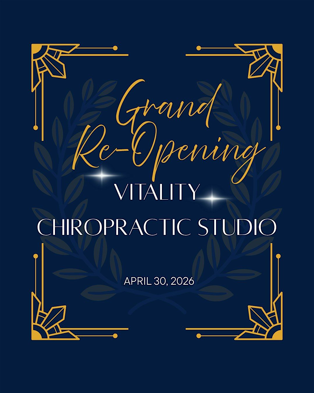 Hey there! We're super excited to invite you to the Vitality Chiropractic Studio Grand Re-Opening! Come join us in person to check out our refreshed space, connect with our awesome team, and learn how we can help you feel your absolute best. It’s gonna be a fun day filled with good vibes and great energy. Don’t miss out, enter our raffles for a chance to win exciting prizes – see you there!