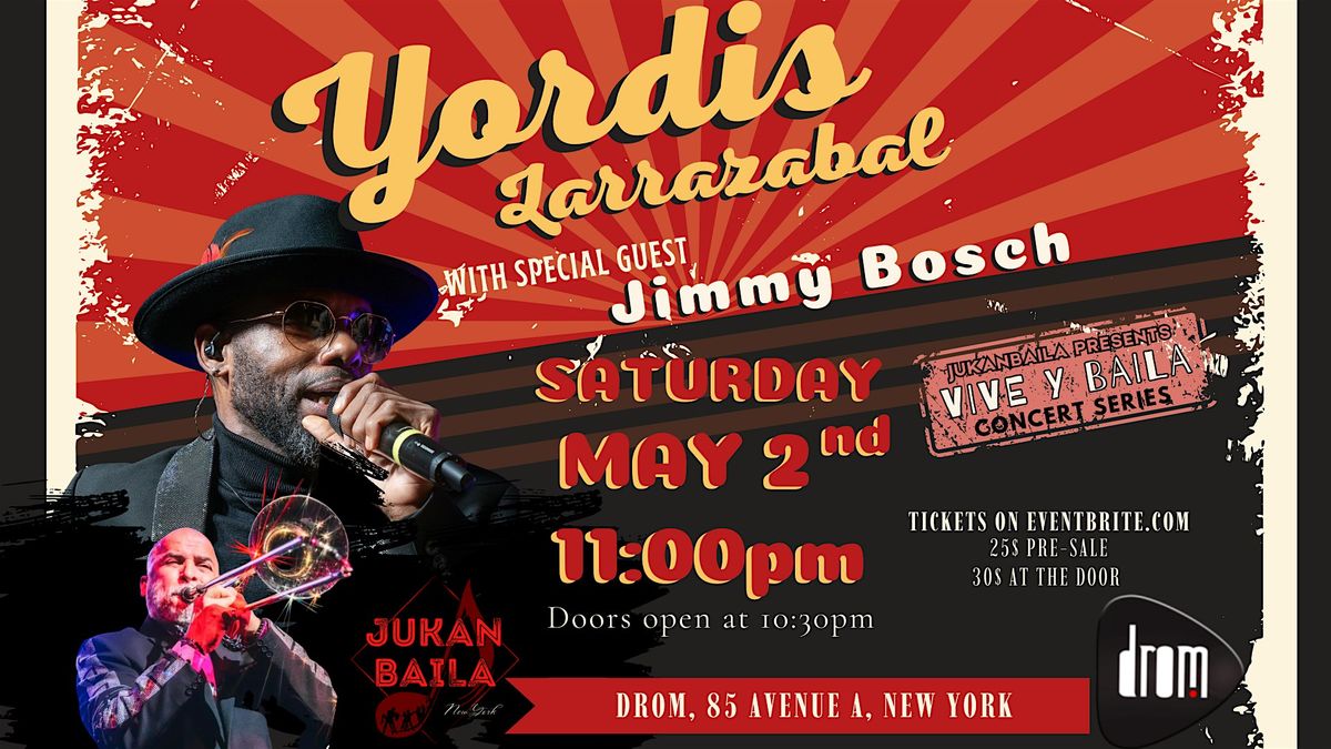 Get ready for the first of many Vive Y Baila Concert Series! Experience an unforgettable night in person with the unique energy of Yordis Larrazabal(Special Guest: Jimmy Bosch). Join us at DROM, feel the music, and let yourself move to the rhythms. Live in New York City—it’s going to be a night filled with music and dancing!