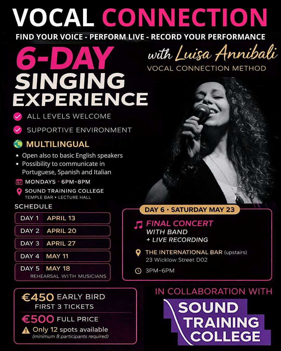 Join our 6-Day Singing Experience with LUISA ANNIBALI’S VOCAL CONNECTION METHOD — a unique journey to build confidence, perform live, and connect deeply with your voice.