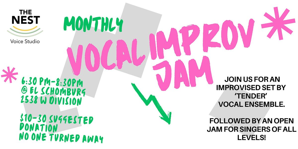 Come experience vocal music that invites you to rest, reflect, and feel the resonance of collaborative creation. The Nest presents an evening of warm and intimate musical nourishment - the Vocal Improv Jam. This event is for singers across genres and styles who are looking to deepen their practice, develop a more intimate relationship with their voices, and feel the support of others in hearing and making new sounds. The evening opens with a short set from Tender, a vocal ensemble (including but not limited to Stacy Erenberg, Emmy Bean, Jacob Rosner, Yvette Mushimiyama, Michele Thomas and friends) and continues with an open jam for all to join or listen to at your own pace. Singers at any level of experience or training are welcome, and we are eager to share this space with you for musical practice, rejuvenation, and real human connection.Β