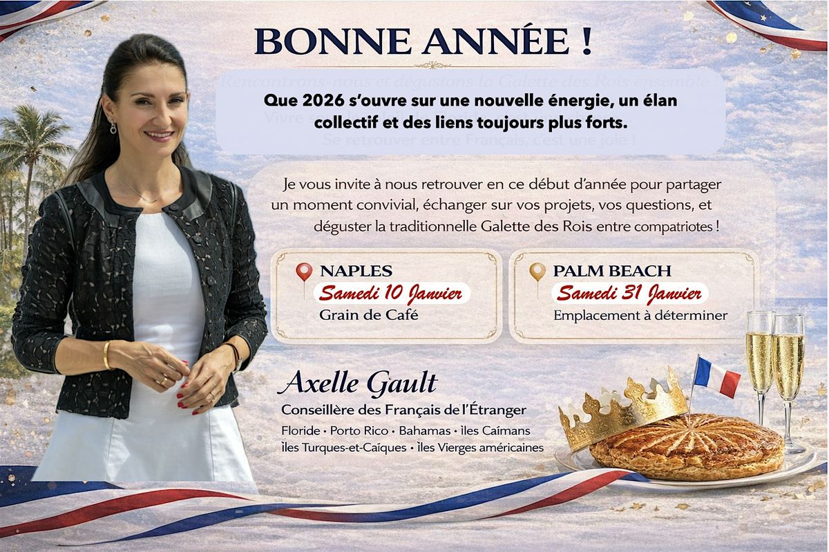 À l’occasion du début de cette nouvelle année, vous êtes conviés à une rencontre conviviale pour échanger nos vœux et partager nos ambitions pour 2026. Cet évènement autour d'une part de galette des rois est une belle opportunité de tisser des liens, de réfléchir ensemble à de nouveaux projets, et de poser les premières pierres d’une belle année pour la communauté française de Floride.