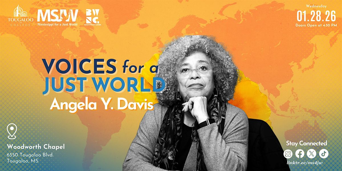 Mississippi for a Just World (MSJW) invites you to the next Voices for a Just World Lecture Series event: an evening with Profressor. Angela Y. Davis, moderated by Dr. Ebony Lumumba at Tougaloo College. Doors open at 4:30 PM, and the program will run from 5:00 PM to 6:30 PM.