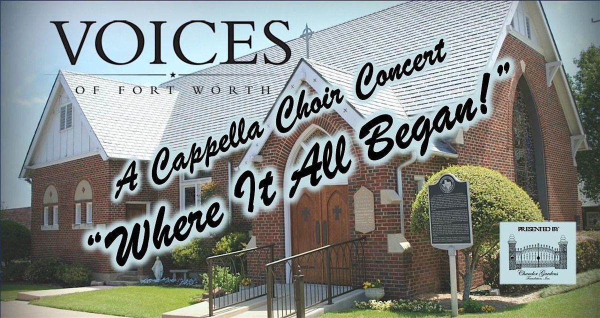 Chandor Gardens Foundation is excited to present VOICES of Fort Worth’s "Where It All Began!" a cappella choral concert on April 11, 2026, at All Saints’ Church, 121 South Waco Street, Weatherford, TX at 3:00 PM. Doors will open for seating at 2:45 PM.