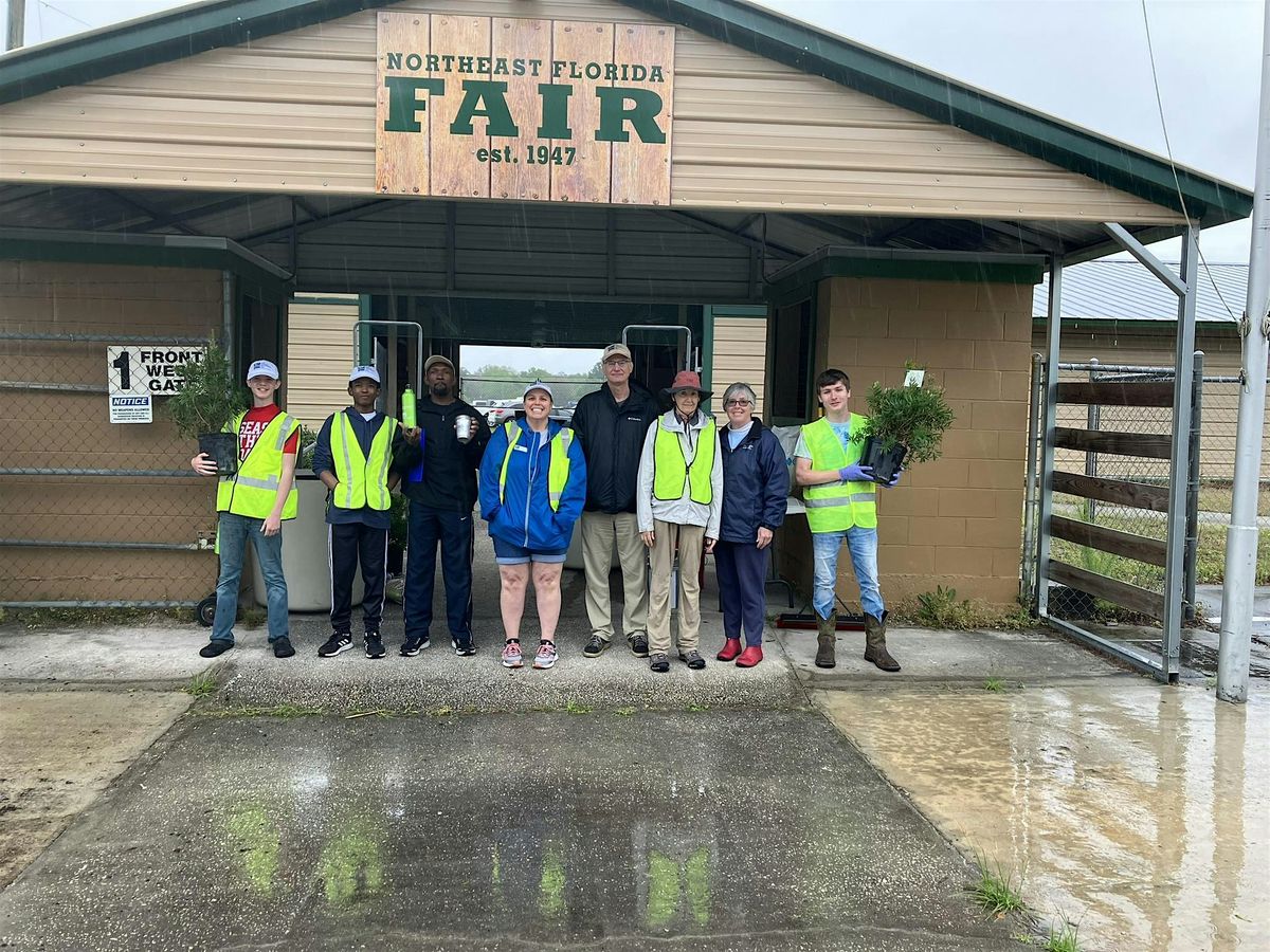 Arrive at the NE FL Fairgrounds Main Gate at 8 am to help us set up and tag the free trees for pickup .