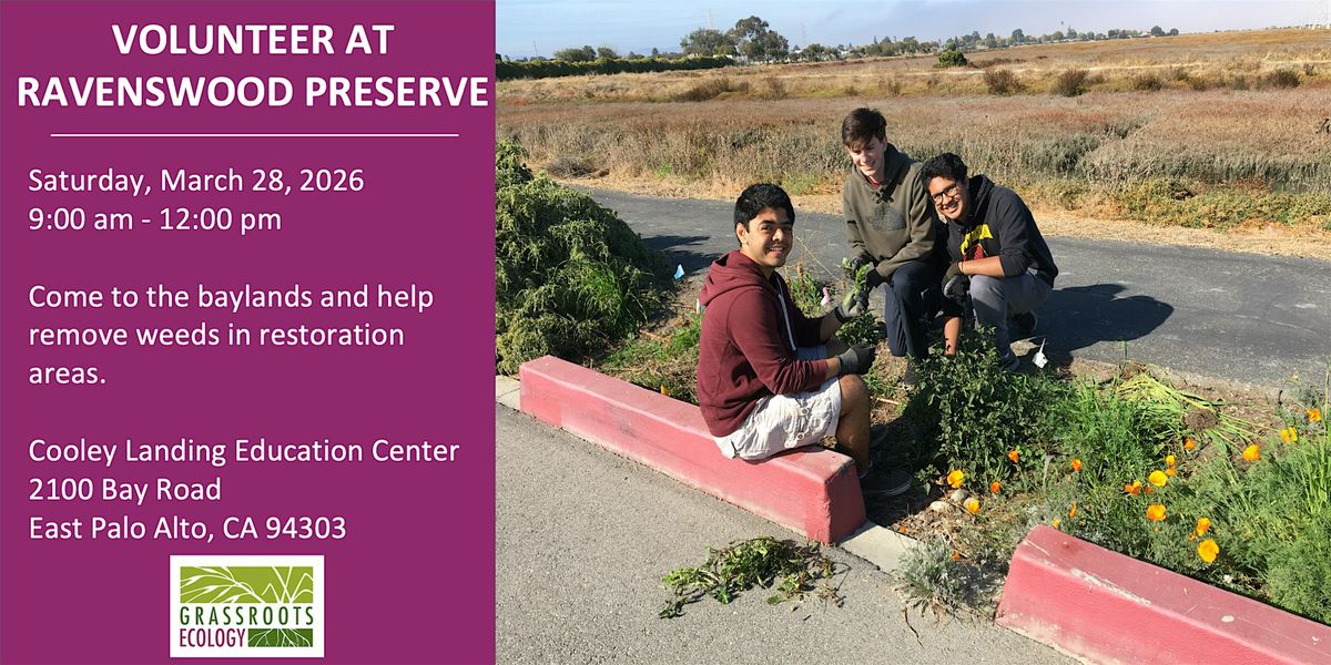 Join Grassroots Ecology at Ravenswood Open Space Preserve for a morning of habitat restoration, no prior experience required! We'll be removing invasive plants from the preserve to improve habitat and to give our native plants support. Our work area will be a 1.5 mile round trip from our meeting area. Volunteers can expect to work on a gentle slope, this includes having their backs bent over for long periods and the use of gardening tools.