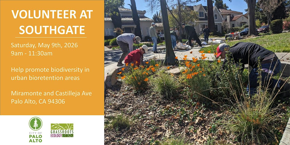 Come together to volunteer at the bioretention area - an innovative type of green infrastructure that naturally filters stormwater runoff and improves water quality - located in the Southgate neighborhood of Palo Alto. We meet once a month and will be weeding springtime annuals that pop up at this time.