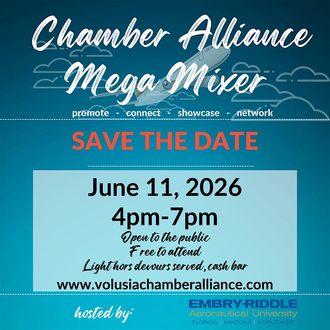 The Mega Mixer event is hosted by the Volusia County Chamber Alliance. THE networking event of the year! Members of any of the Alliance Chambers can sponsor or register for a booth. The event is free and open to the public to attend. Alliance Chambers: Deland and Greater West Volusia, Hispanic Chamber of Commerce Central Florida, Ormond Beach, Daytona Regional, Port Orange & South Daytona, and the Southeast Volusia Chamber.