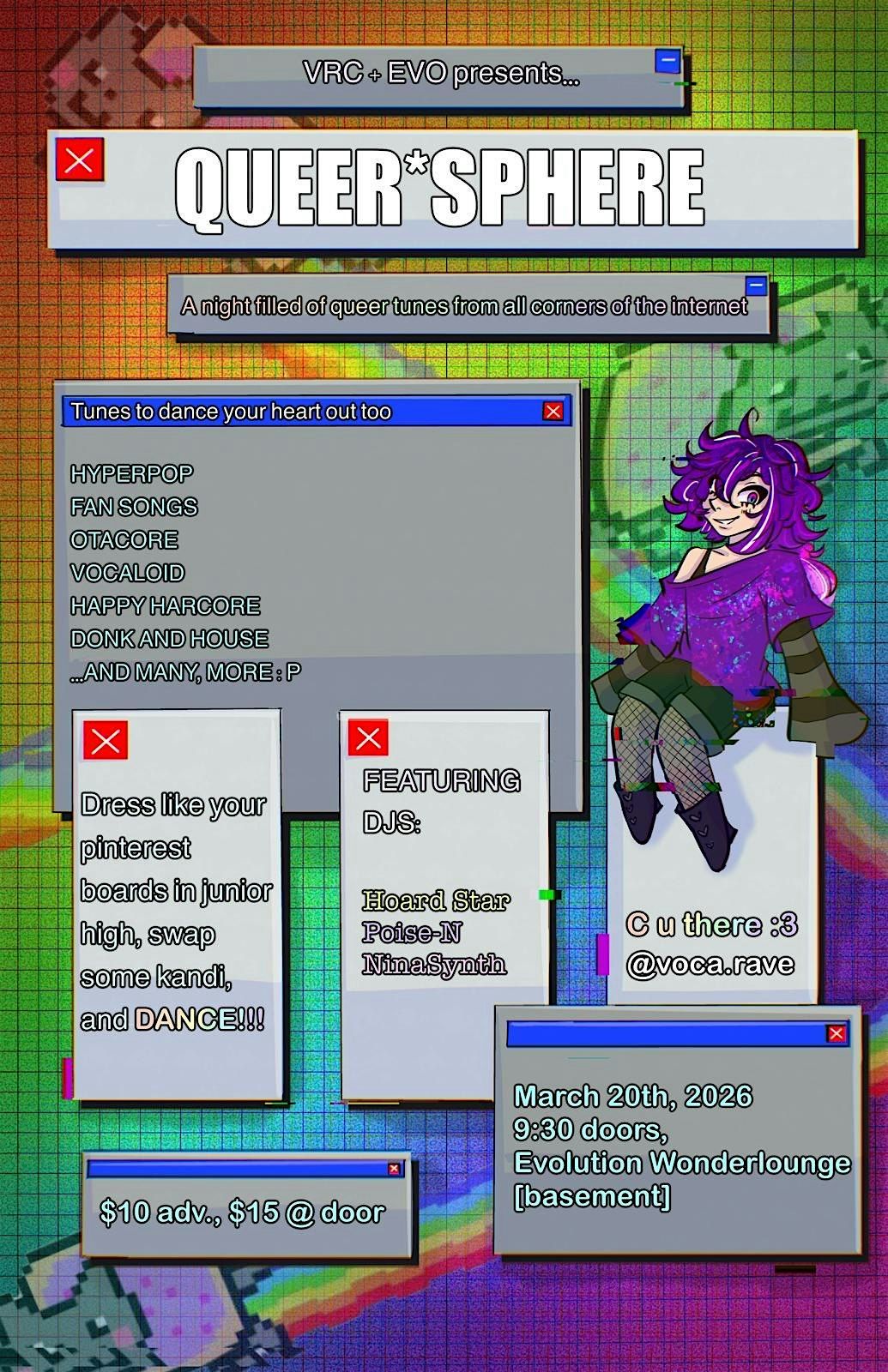 The gays at Voca Rave Collective will bring Vocaloid, Happy Hardcore, Hyperpop, and all genres fast and silly to make the Evolution Wonderlounge night of your dreams!!