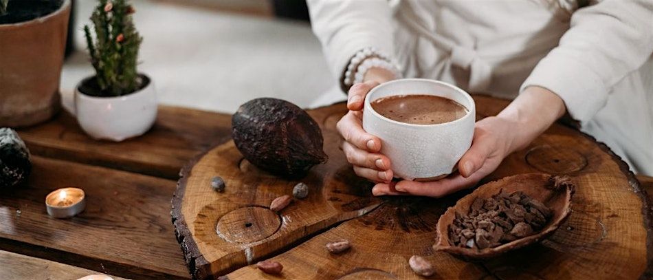 Een rustige bijeenkomst waarin mensen samen pure cacao drinken om te ontspannen en bewuster stil te staan bij hun gevoelens.