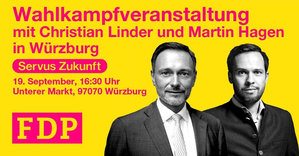 Komm vorbei zur Wahlkundgebung der Liberalen in Würzburg.? Mit dem FDP-Vorsitzenden Christian Lindner und Bayerns Spitzenkandidat Martin Hagen. #ServusZukunft! ?