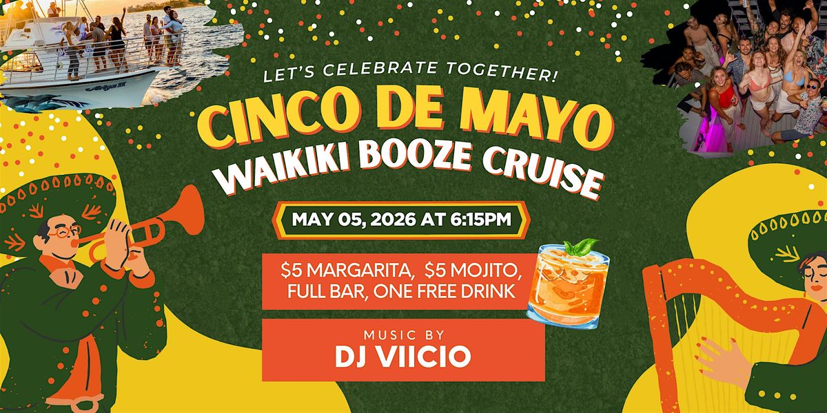 Welcome to the Waikiki Cinco De Mayo Party Cruise (21+)! Come celebrate Cinco De Mayo on a fun boat cruise with a full bar and live DJ VIICIO. Join us on Tuesday, May 5, 2026, at 6:15 PM at Kewalo Basin Harbor. Enjoy music, dancing, drinks, and good times. Don’t miss this fun night – bring your friends and party with us on the water!