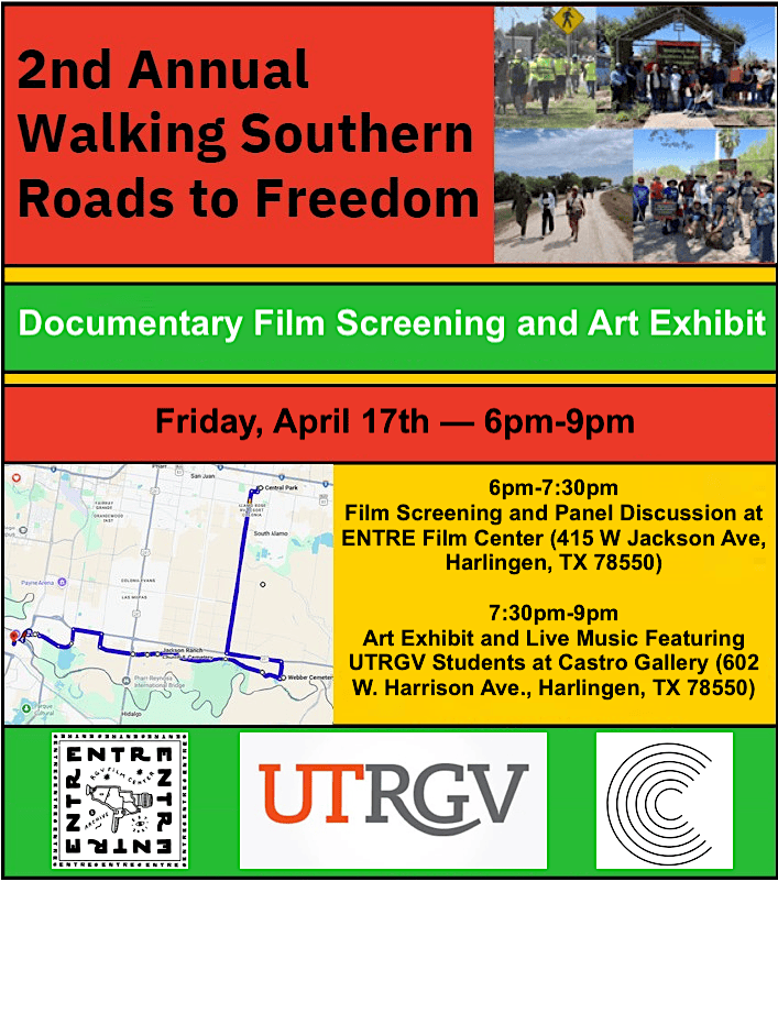 This year a group of UTRGV students documented the walk as part of their Television Production course and will present their work at the ENTRE Film Center along with members of the Walking Southern Roads to Freedom group who took part in the walk.