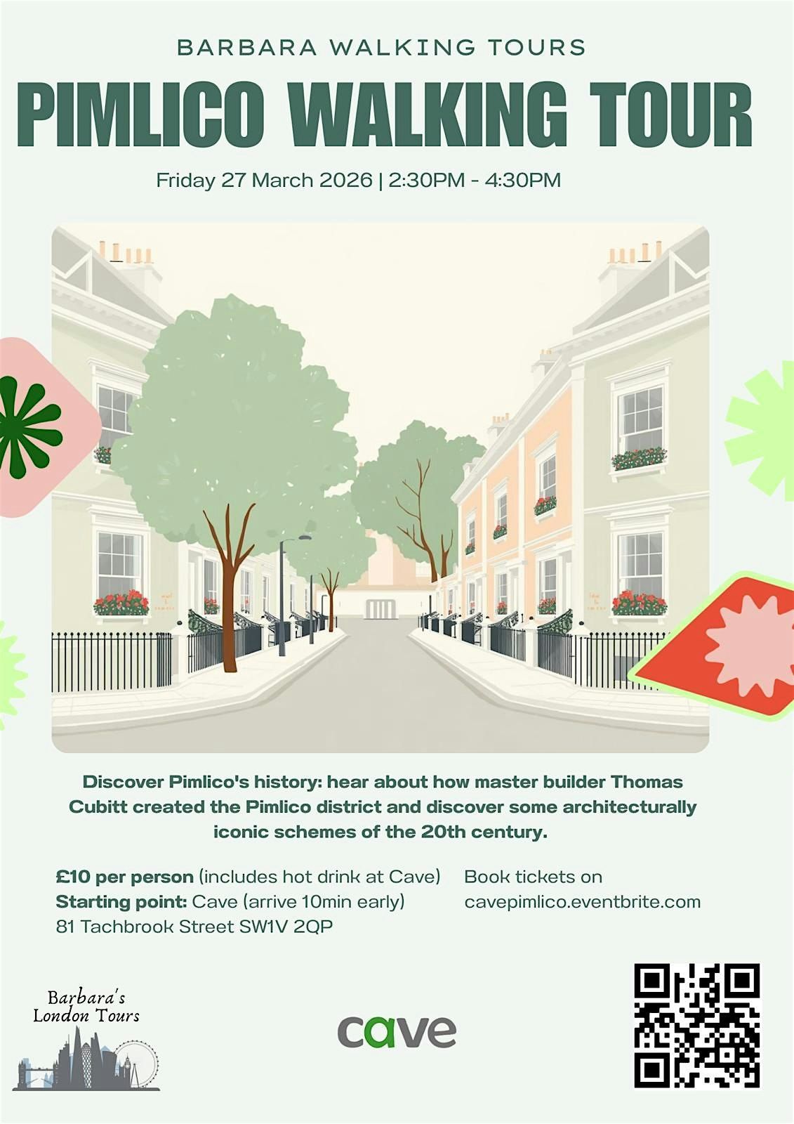 Barbara Wright, qualified City of Westminster and Lamberth Guide, will take you on this walking tour. Hear about how master builder Thomas Cubitt created the Pimlico district. Get under the skin of this remarkable neighbourhood, where Londoners really live, away from the hustle and bustle, and yet only a stone's throw from the country's political centre. Apart from Cubitt's squares and terraces, you will be introduced to some architecturally iconic schemes of the 20th century together with issues in the public housing movement in the UK over time, right to the present day, and hear about some of the interesting people who have lived here. The walk is circular, passing at the end through the market, and starting and finishing at Cave.