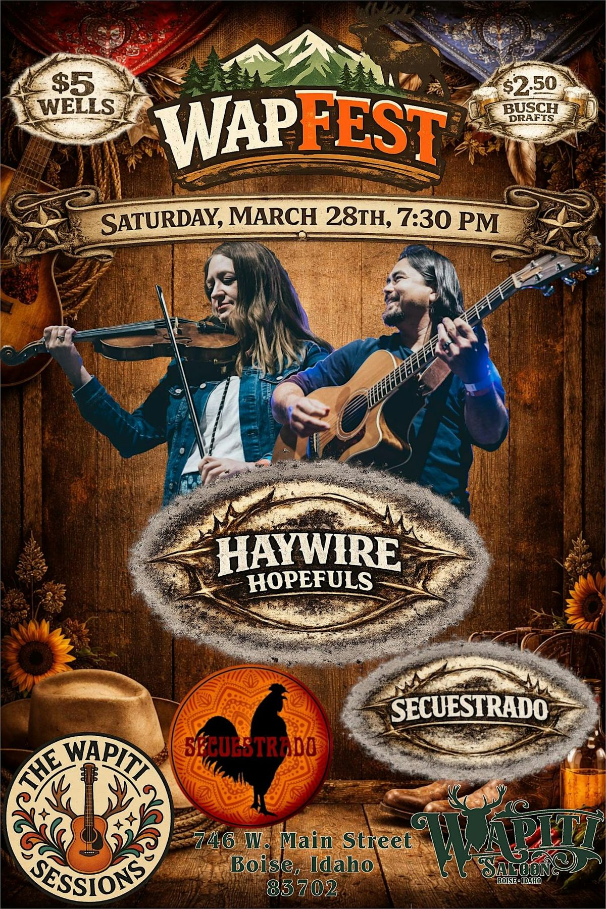 Wapiti Saloon is rolling out WapFest during Treefort week. Four nights of live, local music in a small room with no stage, close-up sets, and an audience that actually listens. Lineups are being announced today, with each night curated to fit the space and the vibe. Music starts at 7:30. $2.50 Busch. $5 wells. Come party with us.