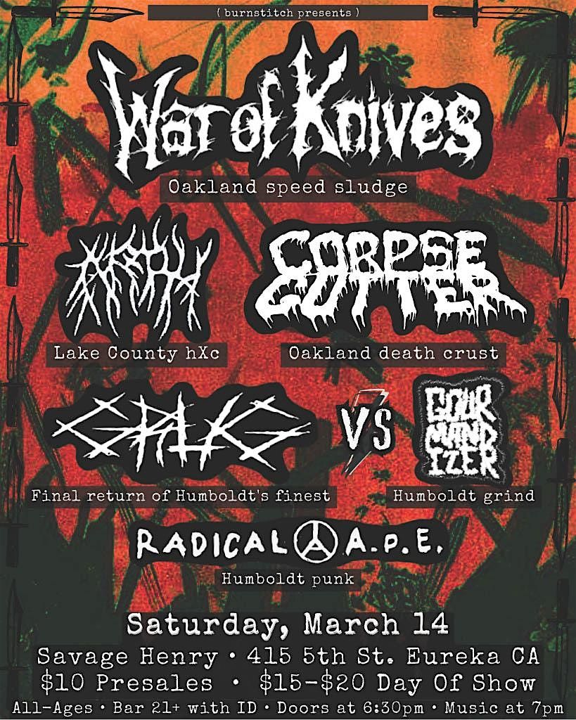 WAR OF KNIVES (Oakland Speed Sludge), ARPH (Lake County HC), CORPSE GUTTER (Oakland Death Crust), Grug, Gourmandizer, & Radical A.P.E rip!!