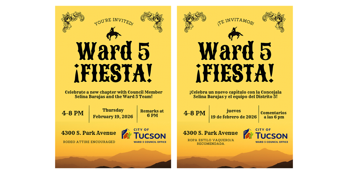 The Ward 5 Team is welcoming all of our Tucson community to meet us, meet neighbors, and celebrate a new chapter with City of Tucson Council Member Selina Barajas! Rodeo attire is encouraged. Stop by anytime between 4:00-8:00pm, with remarks at 6:00pm.