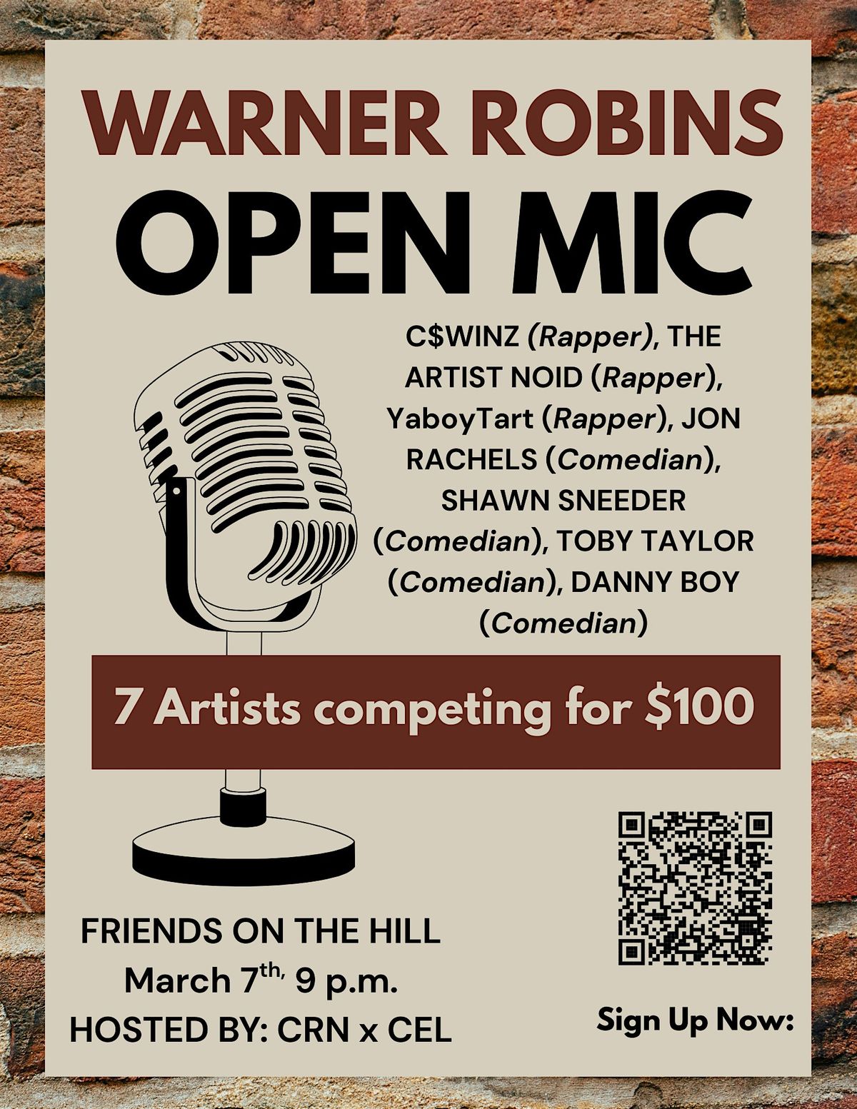 Get ready to shine at the Warner Robins Open Mic—an awesome night full of talent, laughs, and good vibes! Whether you're a singer, poet, comedian, or just love watching live performances, this in-person event is your spot to connect and have fun. Bring your friends, grab a seat, and enjoy the show. Don’t miss out on a night packed with creativity and community—see you there!