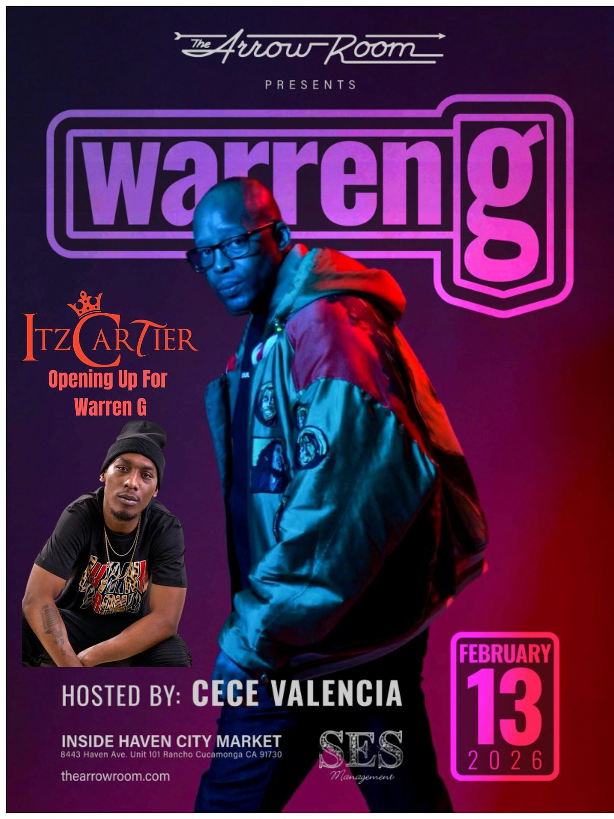 Get ready to vibe with Warren G Feb 13th at the Arrow Room! independent Hip Hop Artist itz Cartier Will Be Hitting The Stage Before Warren G This is an in-person show you won’t wanna miss. Come through, kick back, and enjoy some legendary beats in a chill spot. Mark your calendar and bring your crew for a night of great music and good times!