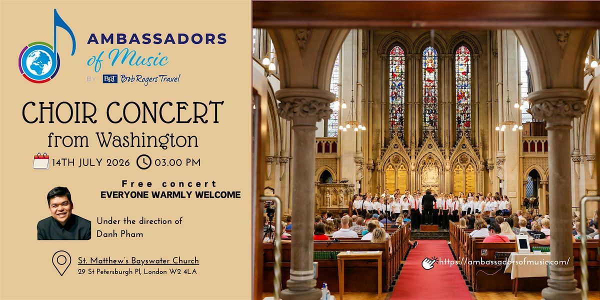 Join us for an amazing in-person performance by the Washington Ambassadors of Music Choir at the beautiful St Matthew's Bayswater Church. Feel the energy and passion as the choir fills the space with uplifting melodies. This is a perfect chance to enjoy some soulful tunes and connect with other music lovers.
