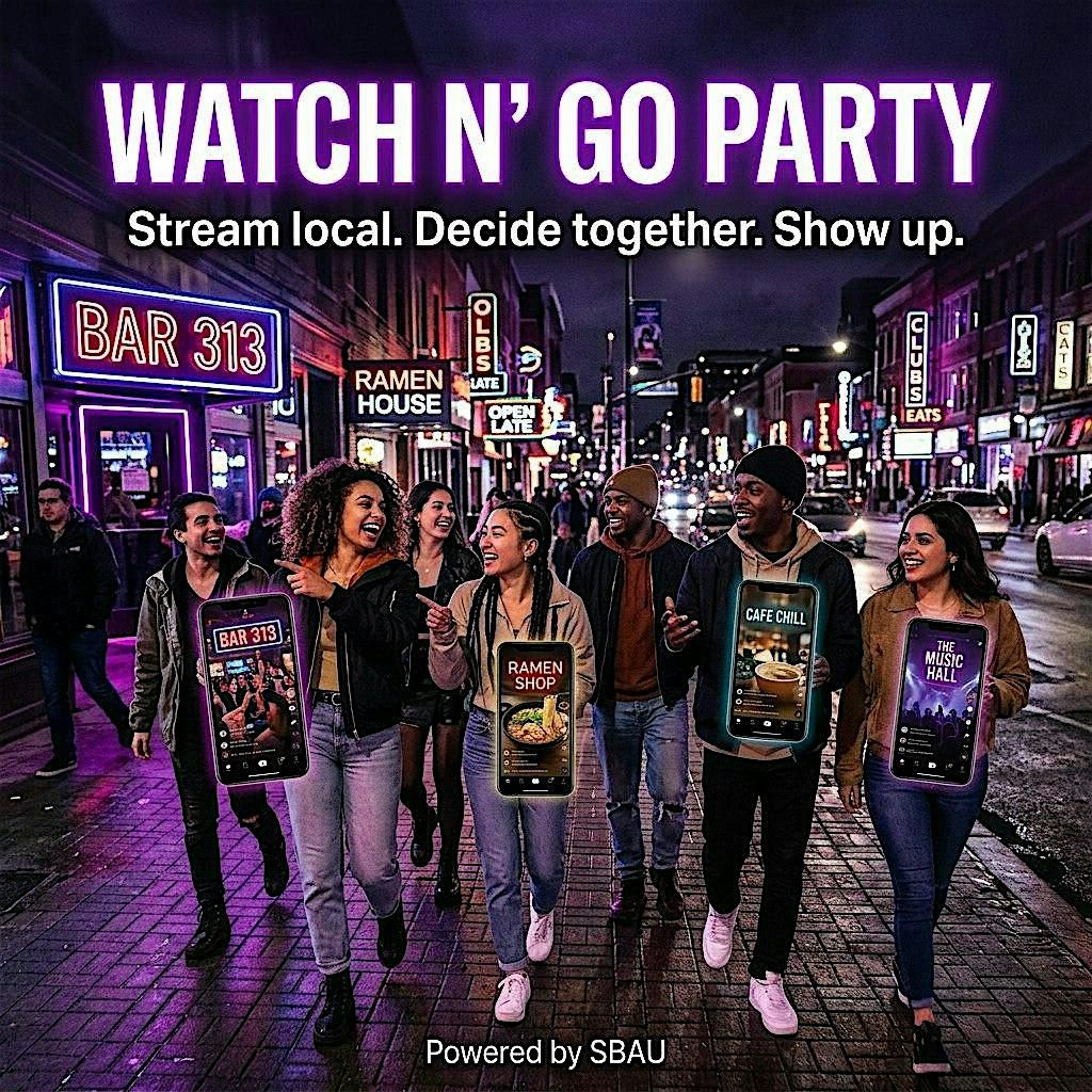 Grab your crew and join us for a live stream watch party unlike anything else. We're pulling up SBAU, scrolling through real-time live streams from different local businesses nearby, and collectively deciding on which spot(s) are we pulling up to?