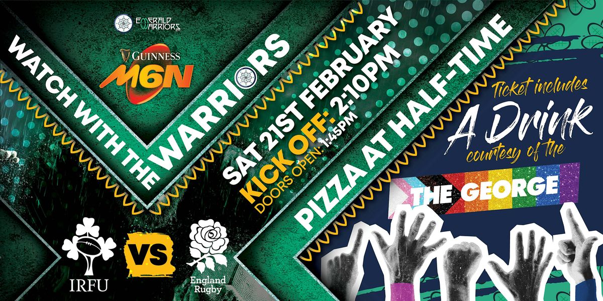 Come on down and watch the Ireland v England match with the Emerald Warriors. Your ticket includes Pizza at half time, and a pint courtesy of The George!